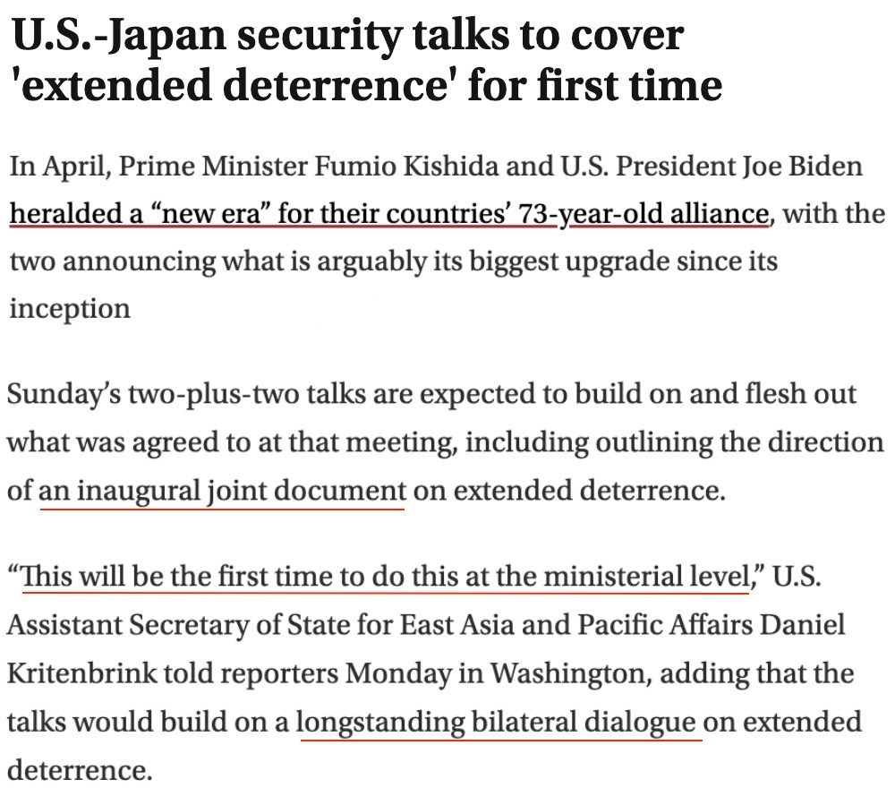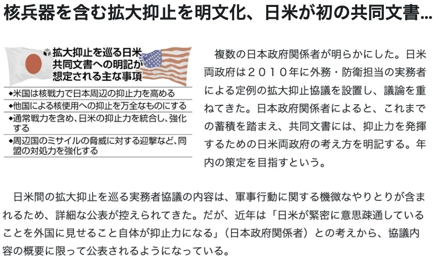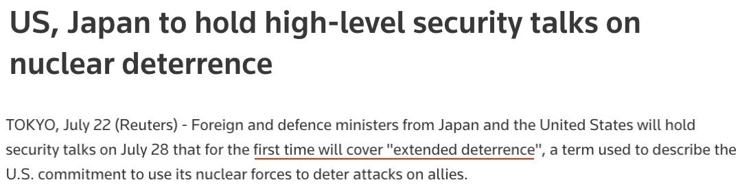 據(jù)多家外媒報(bào)道,日本和美國將于本月28日在東京舉行兩國外交部長和國防部長“2+2”會(huì)談,首次討論“延伸威懾”,即美國承諾使用包括核武器在內(nèi)的軍事力量保護(hù)盟國的問題。