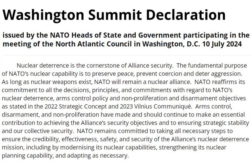 根據(jù)本月早些時(shí)候北約華盛頓峰會(huì)的最后聲明,作為威懾俄羅斯等戰(zhàn)略對(duì)手的重要措施之一,北約決定進(jìn)一步強(qiáng)化核實(shí)力。