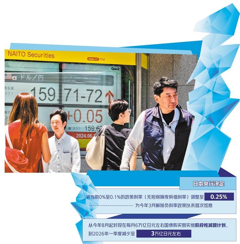 當?shù)貢r間7月31日,日本央行舉行貨幣政策會議,決定將當前0%至0.1%的政策利率(無擔保隔夜拆借利率)調(diào)整至0.25%。此次加息為今年3月解除負利率政策以來的首次加息。此外,日本央行還決定從今年8月起對現(xiàn)在每月6萬億日元左右的國債購買額實施階段性減額計劃,到2026年一季度減少至3萬億日元左右。