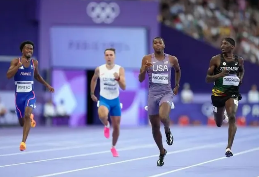 2024年8月5日,美國(guó)選手奈頓(右二)在比賽中。當(dāng)日,巴黎奧運(yùn)會(huì)田徑男子200米第一輪比賽在法蘭西體育場(chǎng)舉行。新華社記者 呂小煒 攝