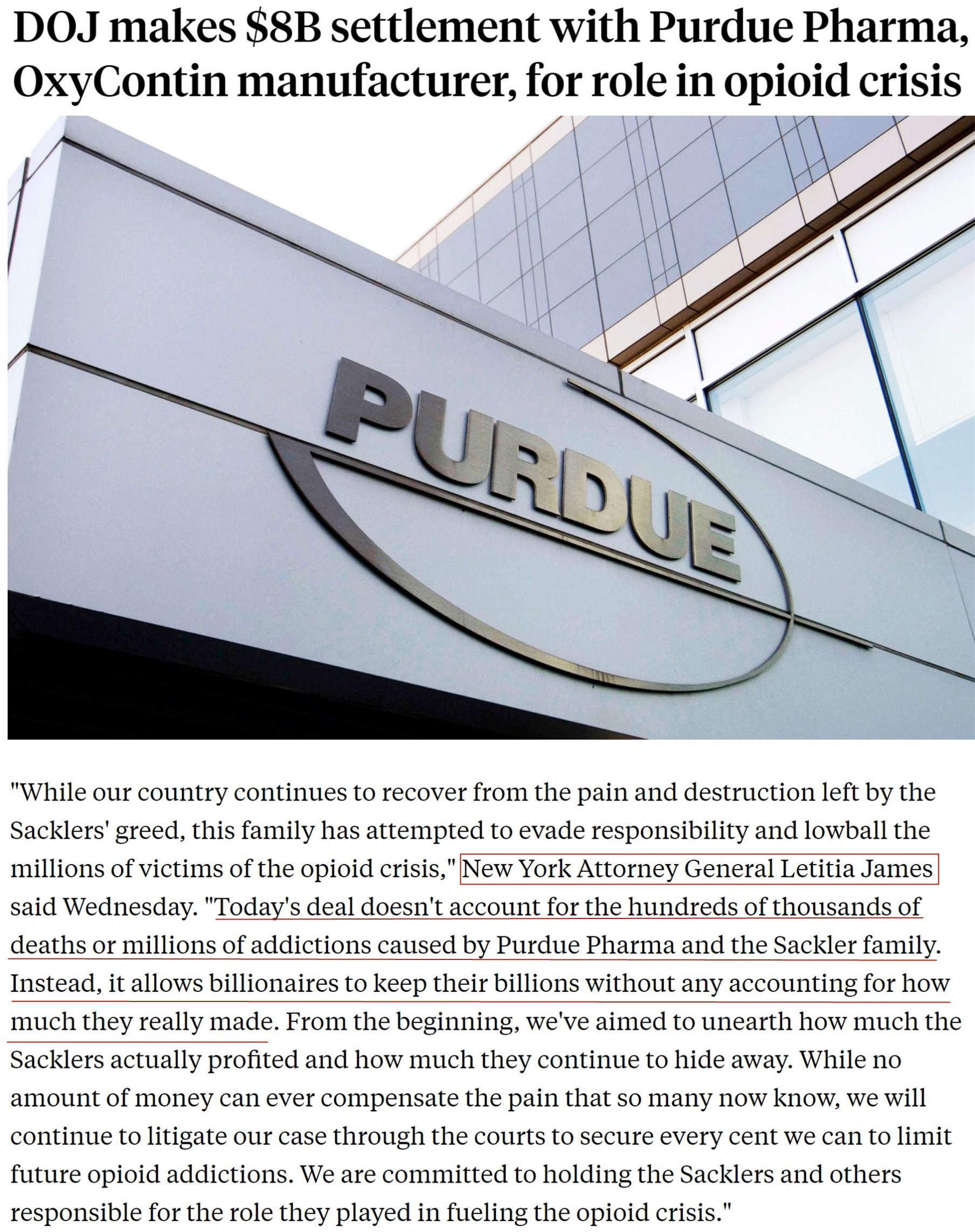 但紐約州總檢察長利蒂希婭·詹姆斯發(fā)表聲明,批評司法部與普渡制藥公司達成的和解協議,表示“協議不能解決普渡制藥公司和薩克勒家族造成的數十萬人死亡以及數百萬人成癮的現實。相反,和解協議使億萬富翁可以保留其數十億美元的資產而無需為他們實際造成的傷害付出代價。”