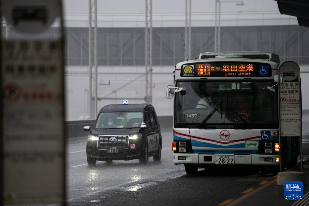 8月16日,在日本東京羽田機(jī)場,車輛行駛在暴雨中。新華社記者 張笑宇 攝