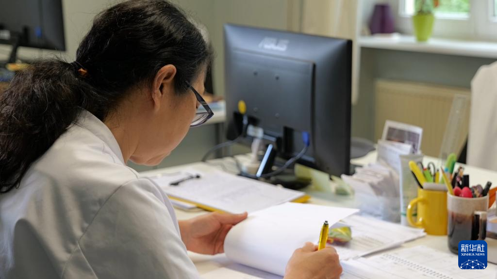 7月11日,在德國巴伐利亞州巴德魁茨汀,北京中醫(yī)藥大學(xué)魁茨汀醫(yī)院的中醫(yī)醫(yī)生在記錄病患信息。 新華社記者 賈金明 攝