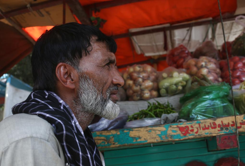 8月13日,在阿富汗首都喀布爾,一位菜販在攤位前等待顧客。新華社發(fā)(塞夫拉赫曼·薩菲 攝)