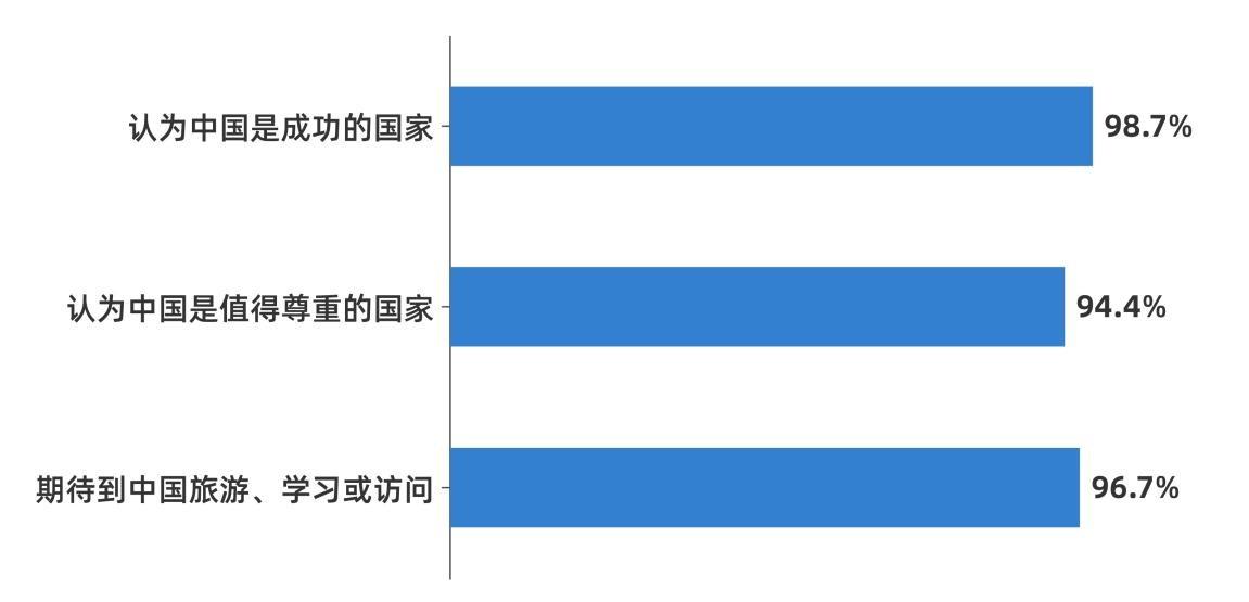 調(diào)查發(fā)現(xiàn),受訪青年普遍有極高的對(duì)華好感度。在對(duì)華總體印象的系列認(rèn)知中,高達(dá)98.7%的受訪青年認(rèn)為中國(guó)是一個(gè)成功的國(guó)家;94.4%的受訪青年認(rèn)為中國(guó)是一個(gè)值得尊重的國(guó)家;96.7%的受訪青年期待未來(lái)有機(jī)會(huì)來(lái)到中國(guó)旅游、學(xué)習(xí)或訪問(wèn)。