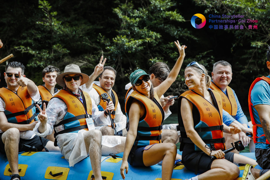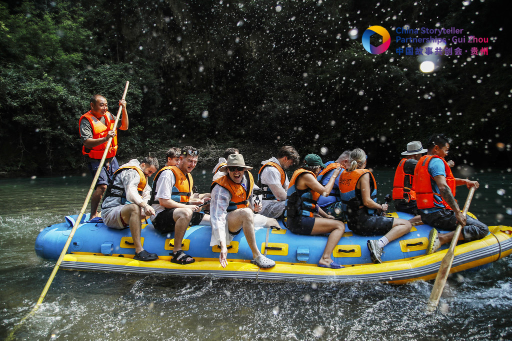 2024中國故事共創(chuàng)會(huì)“外籍網(wǎng)紅貴州行”采訪團(tuán)外籍成員在興義市馬嶺河峽谷體驗(yàn)漂流。