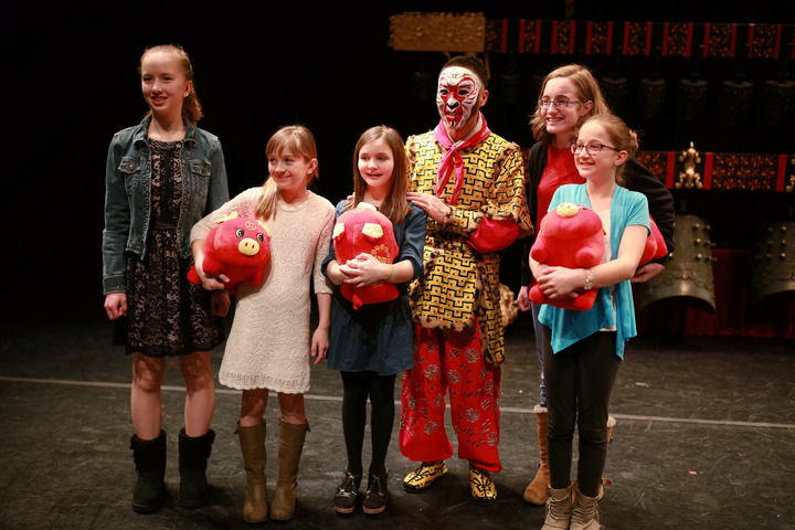 2019年2月14日,在美國馬斯卡廷,當(dāng)?shù)赜^眾在演出結(jié)束后與扮演孫悟空的中國國家京劇院演員合影。當(dāng)晚,由湖北省歌劇舞劇院編鐘國樂團(tuán)和中國國家京劇院一團(tuán)的藝術(shù)家們聯(lián)袂奉獻(xiàn)的“歡樂春節(jié)”大戲在這里上演。新華社記者 汪平 攝