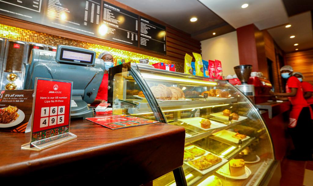2021年9月16日,肯尼亞首都內(nèi)羅畢市中心一家咖啡店的收銀臺(tái)擺放著M-Pesa支付相關(guān)信息。新華社記者張宇攝