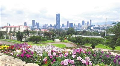 友誼廣場(chǎng)入口,外墻上四個(gè)遒勁有力的漢字“友誼廣場(chǎng)”躍入眼簾,紅底白字,分外醒目。走進(jìn)其中,目光所及皆是綠色,樹木蔥蘢、青草葳蕤,頓覺神清氣爽,仿佛踏入一個(gè)天然氧吧。廣場(chǎng)依山而建,高處連綿起伏的琴弦狀花帶,如同一條條彩帶在空中飛舞;半山腰空曠的廣場(chǎng)上,可遠(yuǎn)眺中央商務(wù)區(qū)的城市景觀;山腳的人工湖波光粼粼,倒映著藍(lán)天白云和綠樹紅花……