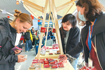 入境游客在上海吳淞口國際郵輪港到達大廳設立的攤位前駐足,了解文創(chuàng)產(chǎn)品。新華社記者 陳愛平攝