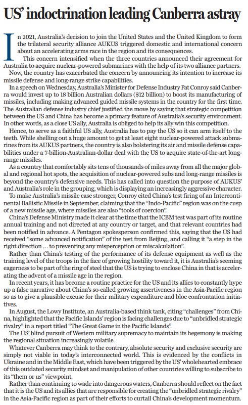 作為一個(gè)遠(yuǎn)離全球和地區(qū)主要熱點(diǎn)的國家,購買核動(dòng)力潛艇和遠(yuǎn)程導(dǎo)彈超出了澳大利亞的防御需要。這不禁令人對“奧庫斯”的目的以及澳大利亞在其中的作用產(chǎn)生疑問,因?yàn)椤皧W庫斯”表現(xiàn)出越來越強(qiáng)的攻擊性。