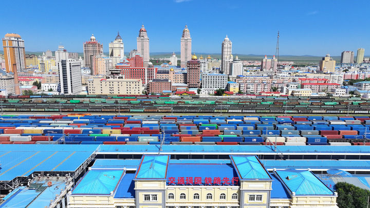 2024年8月20日,出境的中歐班列在中國(guó)鐵路哈爾濱局集團(tuán)有限公司內(nèi)蒙古滿洲里站內(nèi)整裝待發(fā)(無人機(jī)照片)。