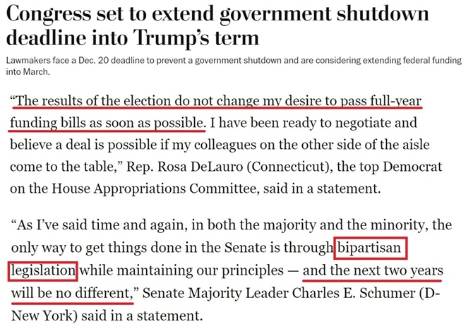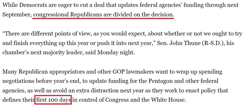 據(jù)報(bào)道,不少共和黨議員、特別是負(fù)責(zé)撥款的議員希望在年底前完成新財(cái)年的總預(yù)算支出談判,避免給特朗普的新政府明年上任后制定政策時(shí)帶來額外干擾,因?yàn)檫@些政策將“決定他們控制國會(huì)和白宮的頭100天”。