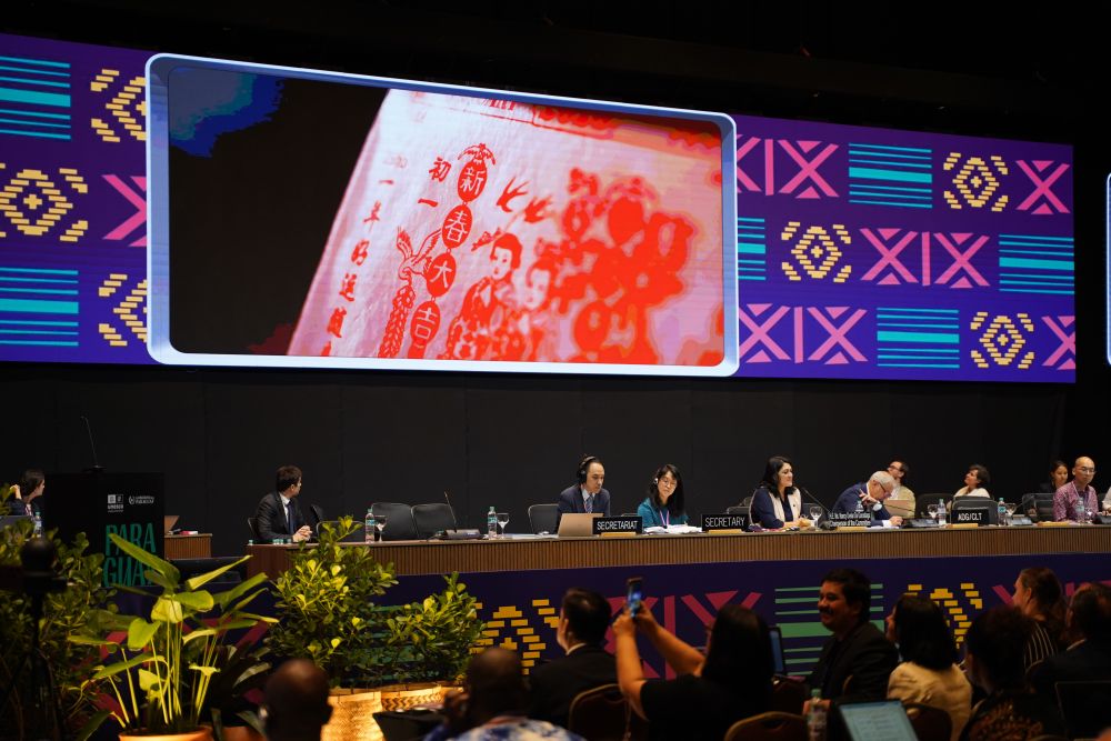 12月4日,在巴拉圭亞松森聯(lián)合國教科文組織保護(hù)非物質(zhì)文化遺產(chǎn)政府間委員會第19屆常會評審現(xiàn)場,大屏幕播放春節(jié)宣傳視頻。新華社記者朱雨博攝