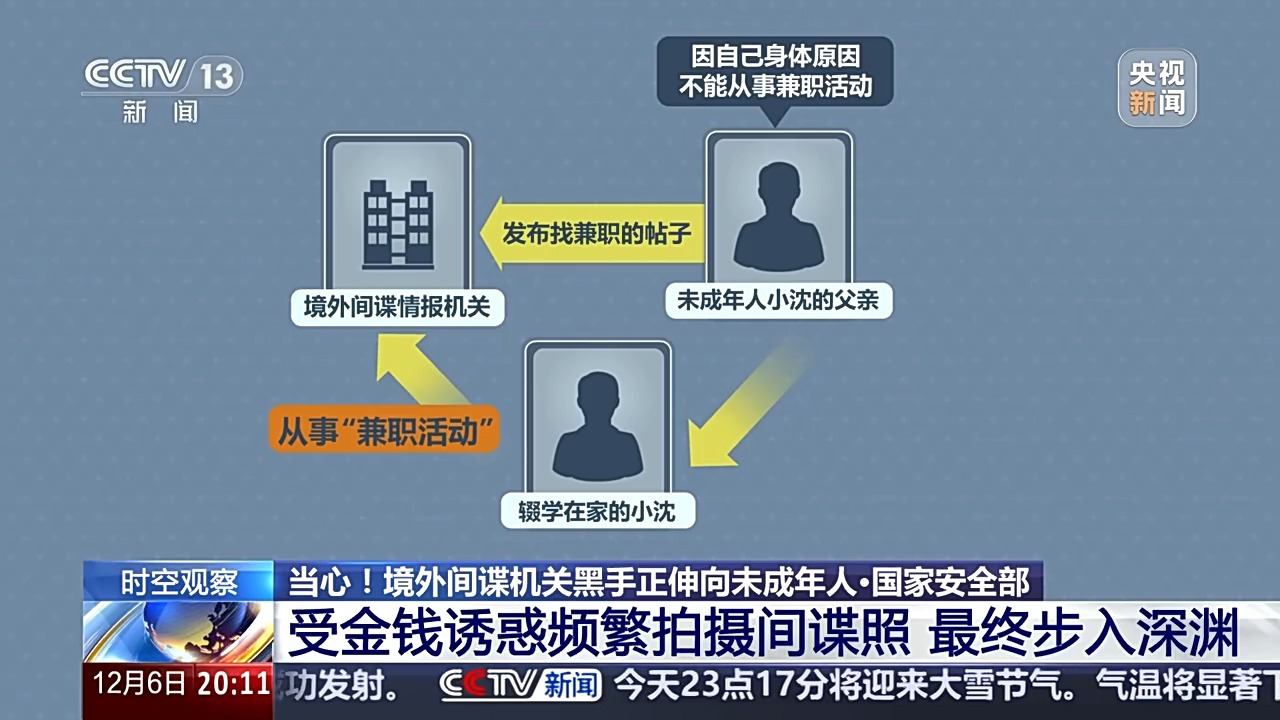 近年來(lái),國(guó)家安全機(jī)關(guān)在案件偵辦中發(fā)現(xiàn),境外間諜情報(bào)機(jī)關(guān)常以網(wǎng)絡(luò)兼職、異性交友為名,通過(guò)網(wǎng)絡(luò)等渠道對(duì)未成年人實(shí)施勾連。鎖定目標(biāo)之后,境外間諜情報(bào)機(jī)關(guān)會(huì)許諾提供報(bào)酬豐厚、內(nèi)容簡(jiǎn)單的兼職機(jī)會(huì),一步步誘導(dǎo)未成年人落入其設(shè)下的陷阱。