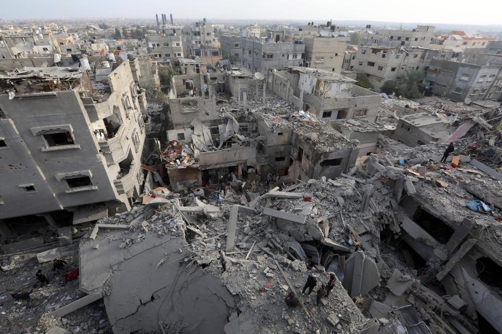 12月7日,在加沙地帶中部努賽賴特難民營,人們走過以軍轟炸后的建筑廢墟。新華社發(fā)(里澤克·阿卜杜勒賈瓦德攝)