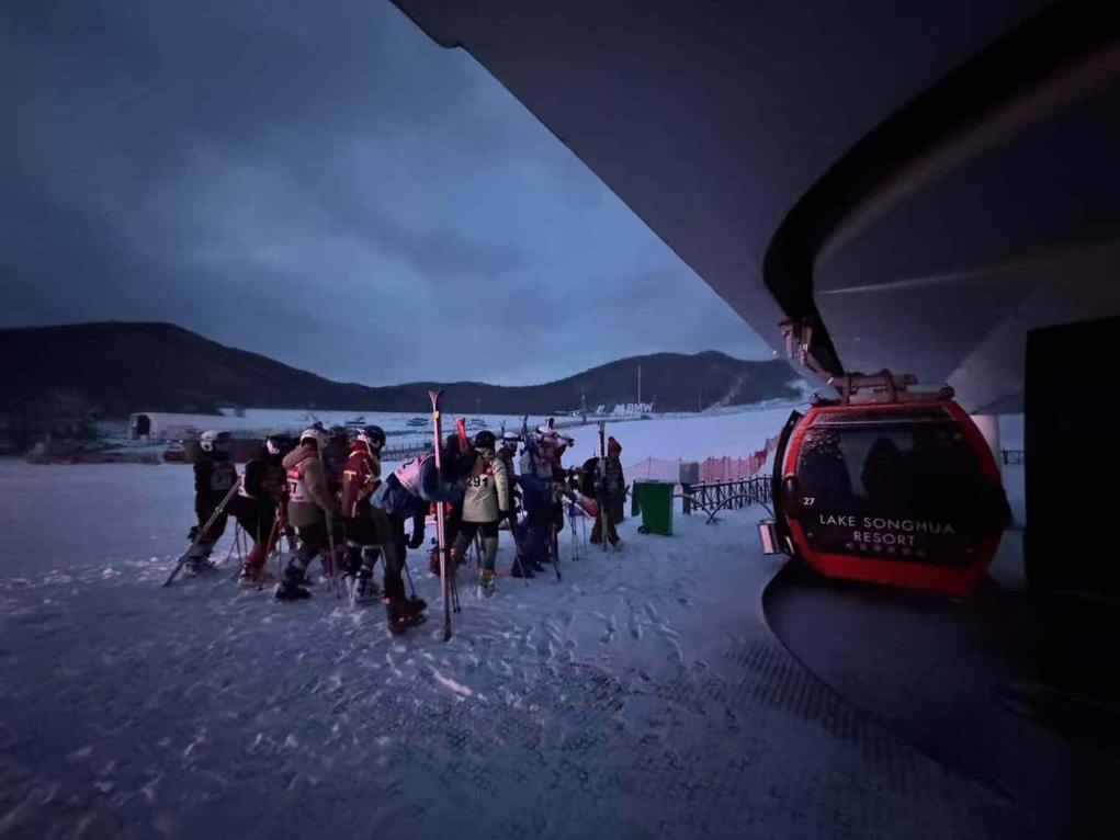 12月2日,在吉林萬科松花湖滑雪度假區(qū),中日兩國滑雪少年一同等待乘坐纜車。受訪者供圖