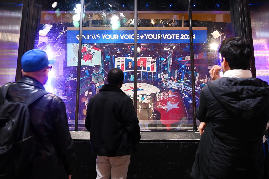 2024年11月5日,人們在美國紐約時報廣場觀看美國總統(tǒng)選舉實時出口民調(diào)。新華社記者 李睿 攝