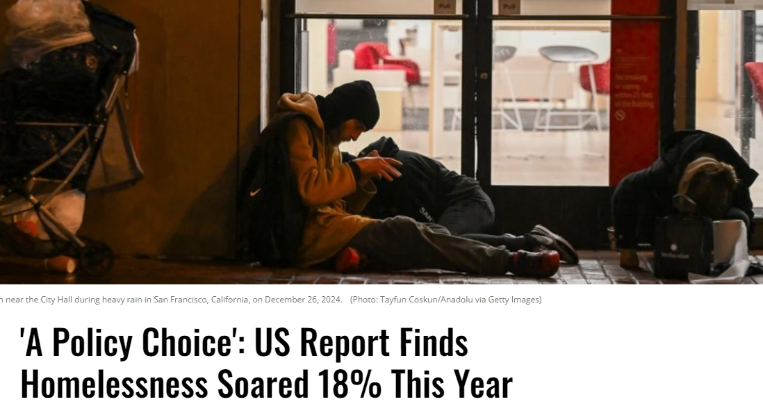 美國住房和城市發(fā)展部(HUD)本月27日發(fā)布報(bào)告稱,美國聯(lián)邦無家可歸者追蹤系統(tǒng)記錄到的無家可歸者數(shù)量已超過77萬,與去年同期相比驟增了18.1%,也是自2007年開始此項(xiàng)統(tǒng)計(jì)以來的最大增幅。對(duì)此,美國《共同夢(mèng)想》網(wǎng)站(Common Dreams)報(bào)道指出,這完全是“政策選擇”,后果可以預(yù)見。