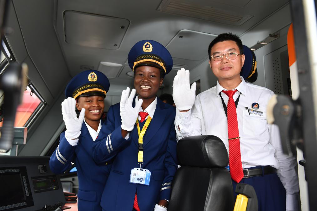 2017年5月31日,在肯尼亞蒙內(nèi)鐵路蒙巴薩西站,火車司機艾麗斯(左)、肯西莉亞(中)和旅客列車指導(dǎo)司機涂主新在蒙內(nèi)鐵路首班列車發(fā)車前揮手致意。(新華社記者孫瑞博攝)