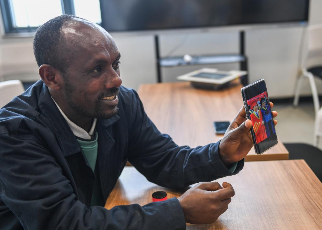 2024年2月15日,在位于亞的斯亞貝巴的埃塞俄比亞聯(lián)邦職業(yè)技術(shù)培訓(xùn)學(xué)院,魯班工坊當(dāng)?shù)亟處熂s納斯·阿凱萊(中文名艾友涵)展示在中國學(xué)習(xí)時的照片。(新華社記者李亞輝攝)