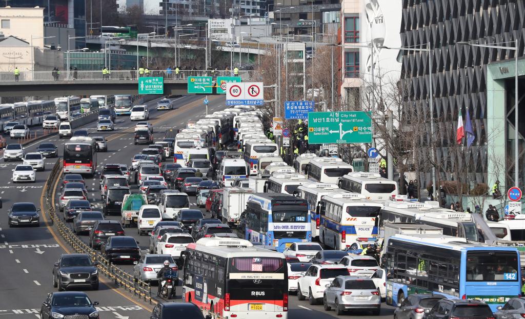 1月3日,大量警方車輛停在韓國(guó)首爾龍山區(qū)漢南洞的總統(tǒng)官邸附近。新華社記者姚琪琳攝