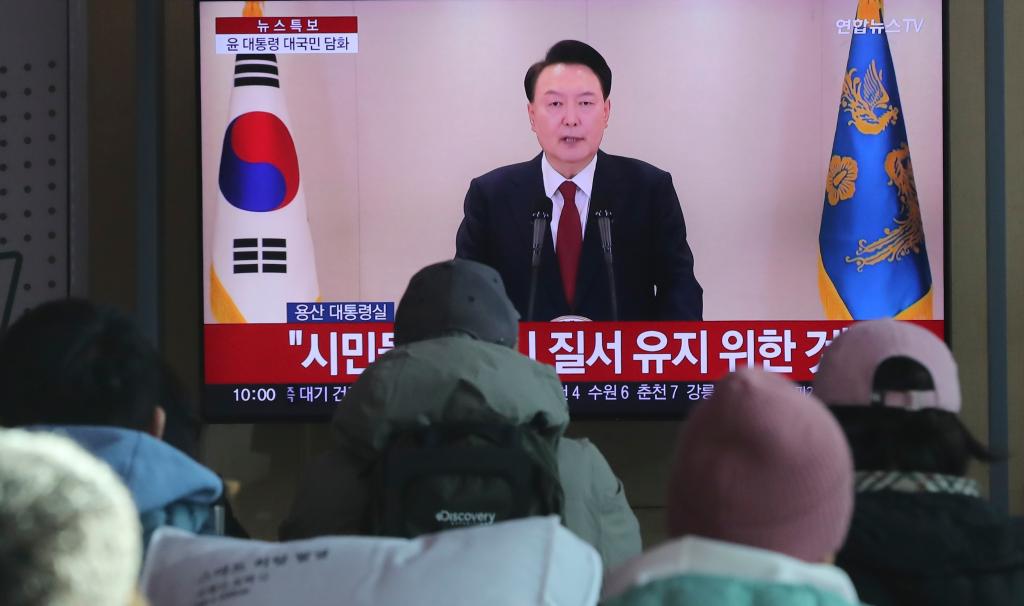 2024年12月12日,在韓國(guó)首爾火車站,韓國(guó)民眾觀看總統(tǒng)尹錫悅對(duì)國(guó)民談話的電視直播。新華社記者姚琪琳攝