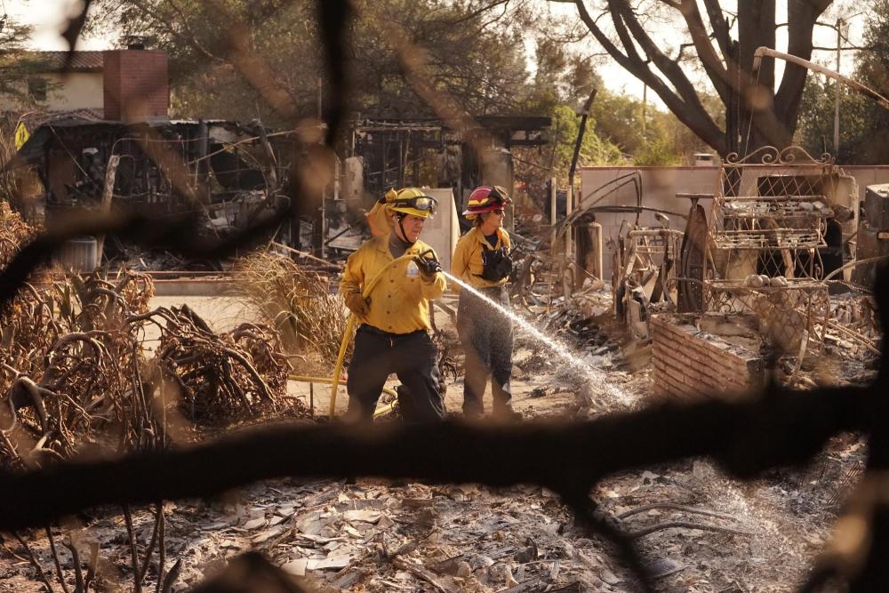 1月10日,在美國加利福尼亞州洛杉磯縣阿爾塔迪納地區(qū),消防員正在努力撲滅山火過后建筑周圍的熱點區(qū)域。新華社發(fā)(曾慧攝)