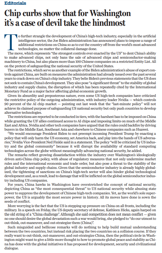1月13日,拜登政府在卸任前夕出臺(tái)人工智能相關(guān)出口管制措施,進(jìn)一步加嚴(yán)對(duì)人工智能芯片、模型參數(shù)等出口管制,還拓展了長(zhǎng)臂管轄,對(duì)第三方與中國(guó)開展正常貿(mào)易設(shè)置障礙、橫加干涉。拜登政府的這一舉措完全無視后果,旨在進(jìn)一步遏制中國(guó)高科技產(chǎn)業(yè),尤其是人工智能領(lǐng)域的發(fā)展。