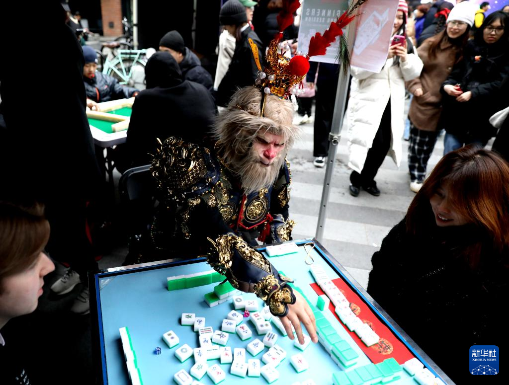 今年,倫敦卡姆登集市首次舉辦了中國春節(jié)慶典活動。喜慶的春節(jié)燈飾高高懸掛,在微風(fēng)中輕輕搖曳;空氣中彌漫著中式點心的香氣,令人垂涎欲滴。人群中,偶爾可見漢服衣袂翩然掠過,許多人手中還拿著紅色的燈籠和“?!弊帧T趹c典活動上,當(dāng)?shù)厥忻裾淠荨っ谞栁值乱贿吅爸芭觥?,一邊開心地將麻將桌上的“南風(fēng)”牌收到面前。她不僅自己打得得心應(yīng)手,還不時給身邊的新手講解規(guī)則。