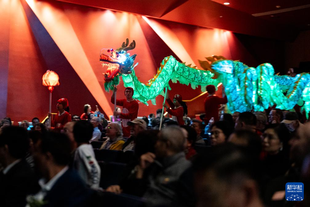 1月26日,演員在美國休斯敦“擁抱春天”春節(jié)聯(lián)歡晚會現(xiàn)場舞龍。新華社發(fā)(陳晨攝)