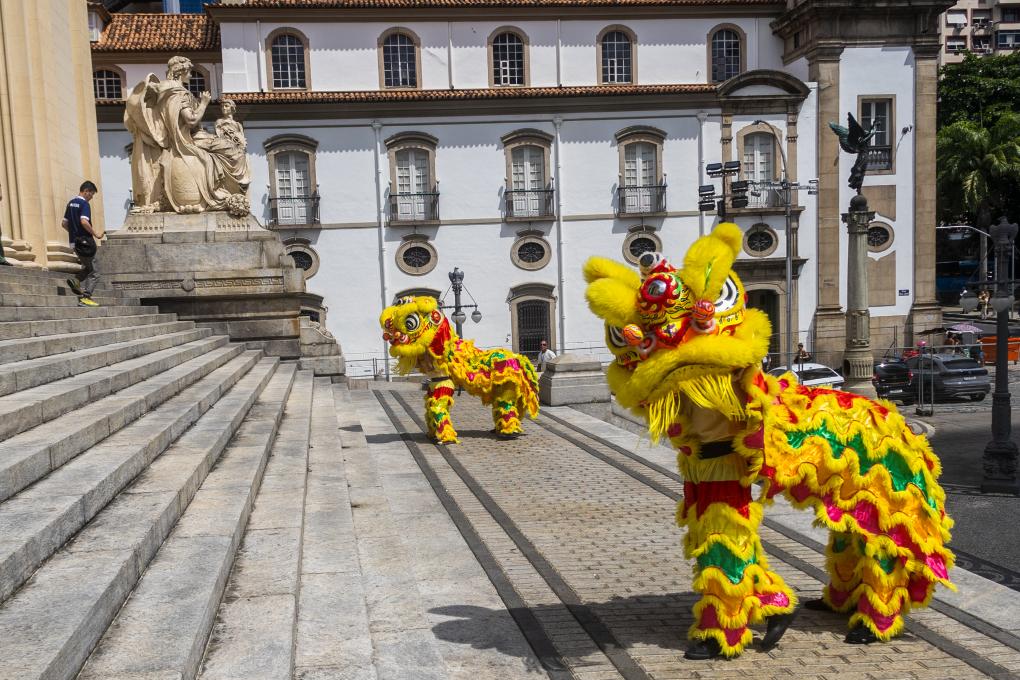 2月6日,在巴西里約熱內(nèi)盧州蒂拉登特斯宮(州議會)大門外,演員在表演舞獅。新華社發(fā)(克勞迪婭·馬爾提尼 攝)