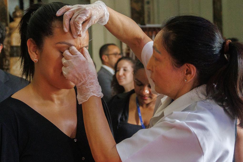 嘉賓們隨后來到蒂拉登特斯宮入口大廳處,體驗(yàn)書法、針灸等,并在寫有“巳巳如意 生生不息”的簽名板上簽名留念。