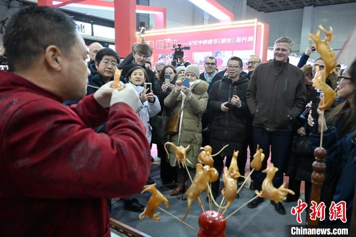 2月7日,多位駐華使節(jié)在廊坊國(guó)際年貨節(jié)上被吹糖人技藝吸引。中新社記者 翟羽佳 攝