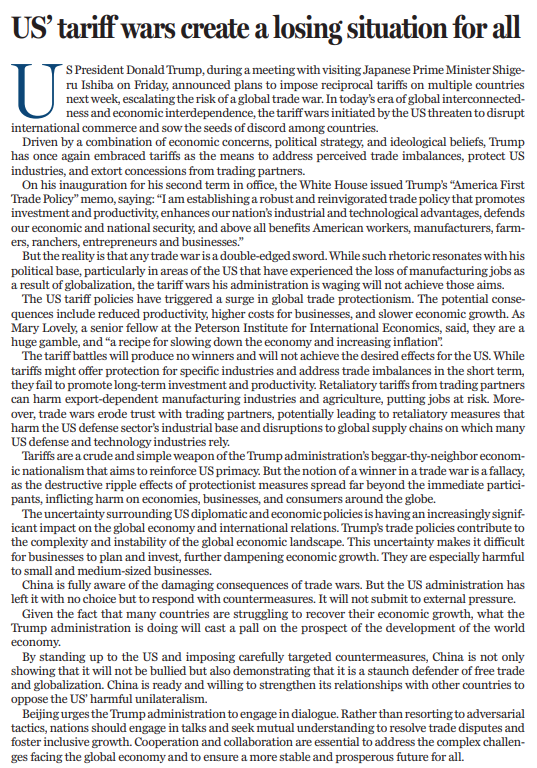 上周五,美國總統(tǒng)特朗普在會見到訪的日本首相石破茂時宣布,下周將向多個國家征收“對等關稅”。由此,全球貿易戰(zhàn)風險升級。當今,世界互聯(lián)互通,經(jīng)濟相互依存,美國發(fā)起的關稅戰(zhàn)或將擾亂國際貿易,使得各國心生間隙。