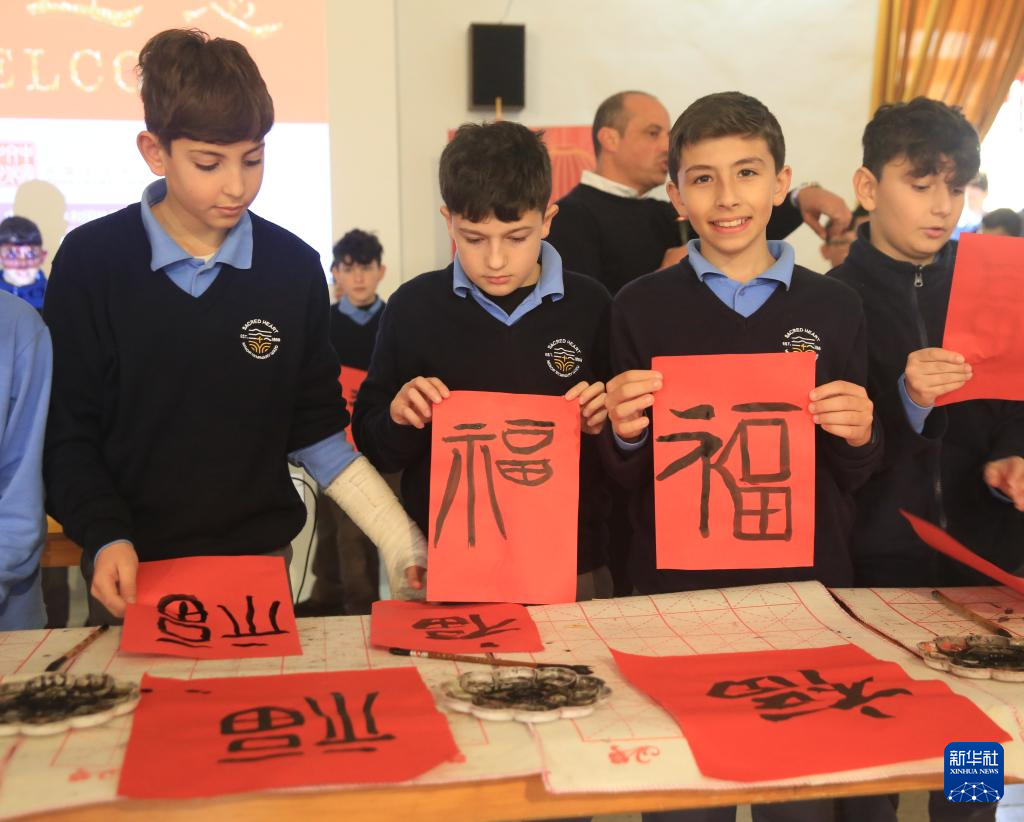 與此同時(shí),在學(xué)校禮堂內(nèi),學(xué)生們正在熱火朝天地體驗(yàn)中國書法藝術(shù)的獨(dú)特魅力。馬耳他中國文化中心的工作人員為學(xué)生們講解中國文房四寶的歷史淵源,現(xiàn)場(chǎng)演示書法基本技法。隨后,學(xué)生們興致勃勃地練習(xí)書寫,感受中國書法的韻味,他們?cè)谛埳狭粝碌哪E勾勒出對(duì)東方文化的向往。當(dāng)一個(gè)個(gè)工整的“福”字、“春”字躍然紙上時(shí),學(xué)生們興奮不已,互相欣賞彼此的作品。
