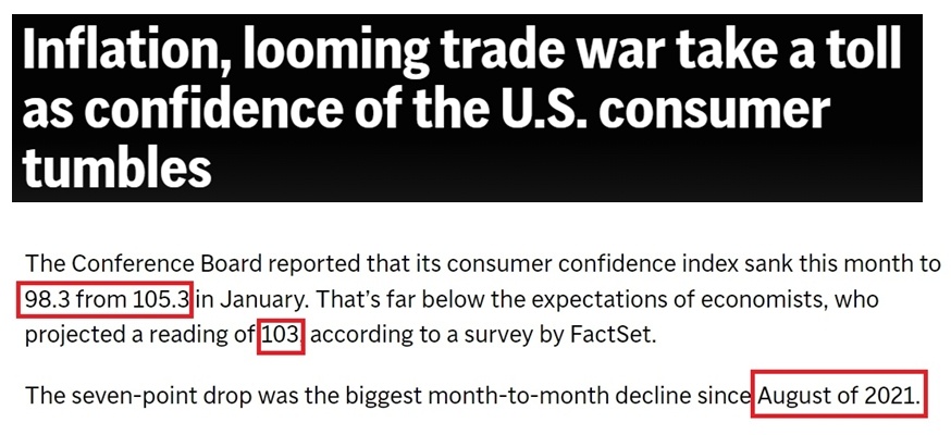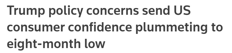報(bào)道稱,特朗普是因?yàn)橄蛎绹顺兄Z會降低通脹和物價(jià)才當(dāng)選總統(tǒng)的。在他獲勝后,美國企業(yè)和消費(fèi)者信心曾一度飆升。但他在上任后的僅僅一個(gè)月內(nèi)就宣布了連串加征關(guān)稅計(jì)劃,從而“導(dǎo)致美國消費(fèi)者信心暴跌至八個(gè)月以來的最低點(diǎn)”。