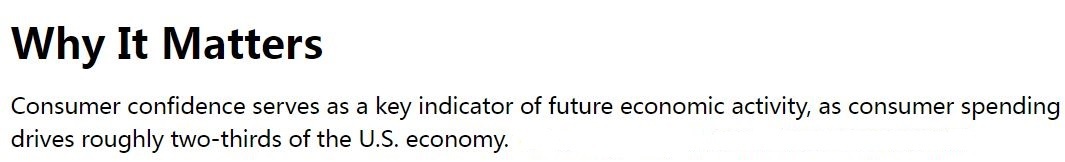 CCI既反映美國人對當(dāng)前經(jīng)濟(jì)狀況的評估,也反映他們對未來六個(gè)月的展望,是預(yù)測美國未來經(jīng)濟(jì)前景的關(guān)鍵指標(biāo)。