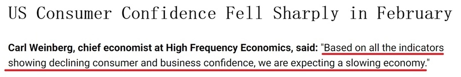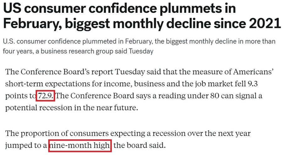 各家媒體紛紛用“暴跌”“直線下降”“急劇惡化”等詞匯來形容美國消費(fèi)者信心的顯著下滑。