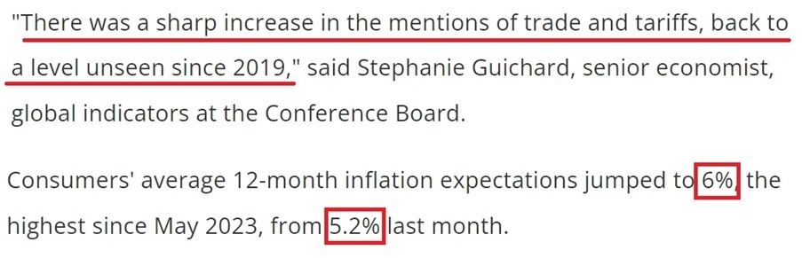 在美國CCI以三年半以來的最大速度惡化的同時(shí),美國消費(fèi)者對未來一年的通脹預(yù)期也從5.2%大幅升高至6%,達(dá)到2023年5月以來的最高水平。這進(jìn)一步顯示,美國人對特朗普政府政策可能對經(jīng)濟(jì)造成的負(fù)面影響越來越擔(dān)憂。