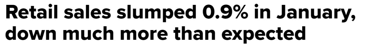 與此相應(yīng)地,美國1月零售額環(huán)比下降0.9%,大大超出此前下降0.2%的預(yù)期,創(chuàng)下近兩年來的最大月度環(huán)比跌幅。