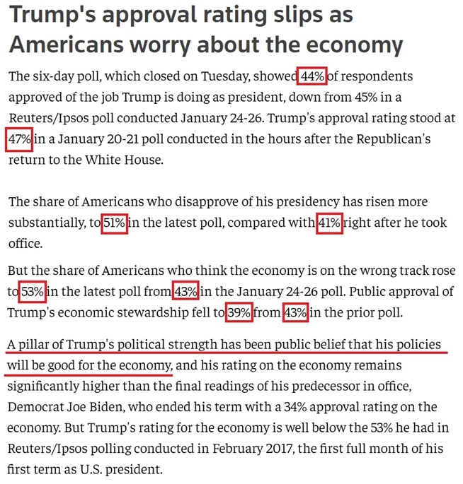 根據(jù)路透社與益普索集團(tuán)聯(lián)合進(jìn)行的一項(xiàng)最新民調(diào)結(jié)果,對特朗普的總統(tǒng)工作表示認(rèn)可的受訪美國人比例已從他剛剛重返白宮后的47%降至44%,而不滿意他工作的受訪者比例則從他剛剛上任時(shí)的41%大幅上升到了51%。