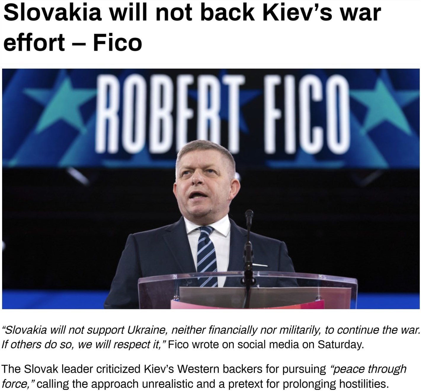 斯洛伐克總理菲佐則在社交媒體上發(fā)文,重申拒絕向?yàn)蹩颂m提供軍事和財(cái)政支持的立場。他還批評稱,“用實(shí)力實(shí)現(xiàn)和平”的戰(zhàn)略不切實(shí)際,只是“繼續(xù)沖突”的借口。