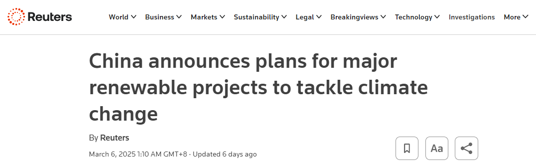 據(jù)路透社報(bào)道,中國(guó)政府5日宣布,將推出一系列重大可再生能源項(xiàng)目,力爭(zhēng)在2030年前實(shí)現(xiàn)二氧化碳排放峰值,并在2060年達(dá)成碳中和目標(biāo)。