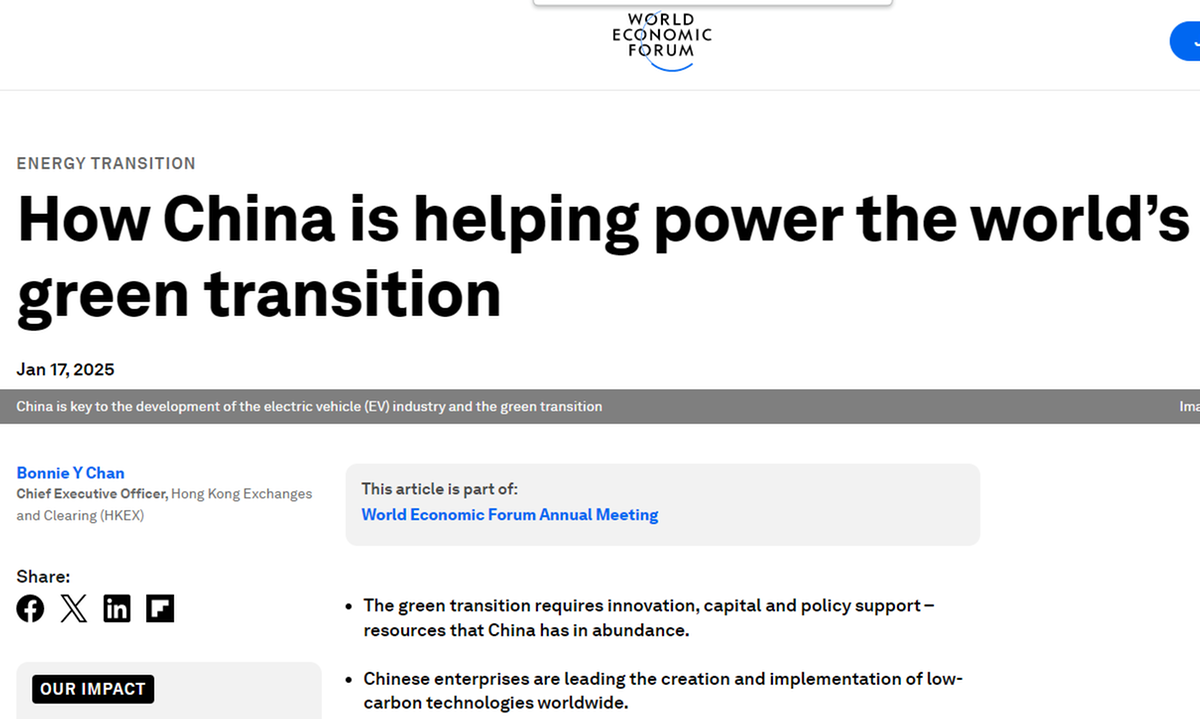 世界經(jīng)濟(jì)論壇網(wǎng)站題為《中國(guó)助力全球綠色轉(zhuǎn)型》的文章強(qiáng)調(diào),中國(guó)在推動(dòng)全球綠色轉(zhuǎn)型過程中具有關(guān)鍵作用,特別是在電動(dòng)車、可再生能源及低碳技術(shù)領(lǐng)域。
