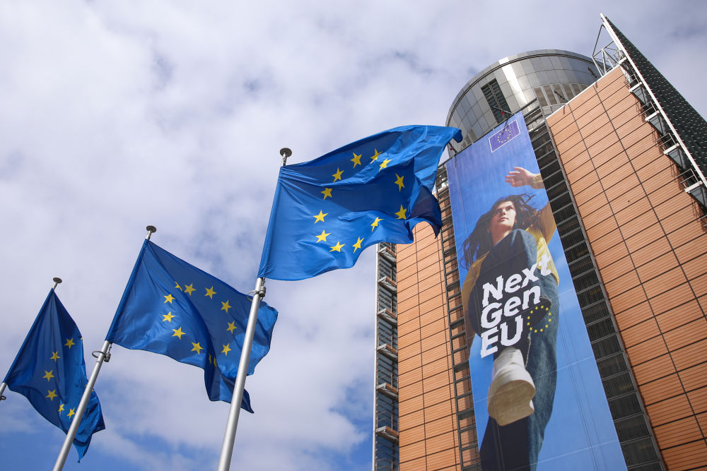 2021年5月21日,歐盟旗幟在比利時(shí)布魯塞爾的歐盟總部外飄揚(yáng)。新華社記者鄭煥松攝