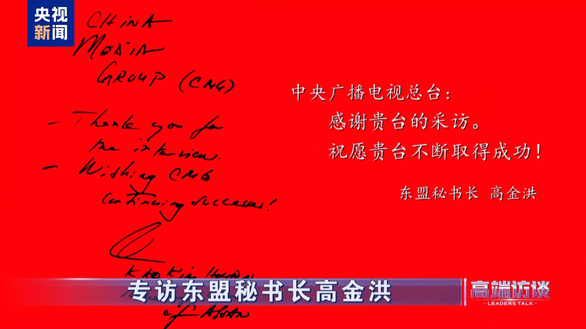 東盟秘書長高金洪在接受總臺(tái)專訪后題詞——中央廣播電視總臺(tái):感謝貴臺(tái)的采訪。祝愿貴臺(tái)不斷取得成功!
