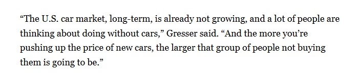 “從長(zhǎng)期來(lái)看,美國(guó)汽車市場(chǎng)已不再增長(zhǎng),越是推高新車價(jià)格,不買(mǎi)車的人就會(huì)越多?!?/p>