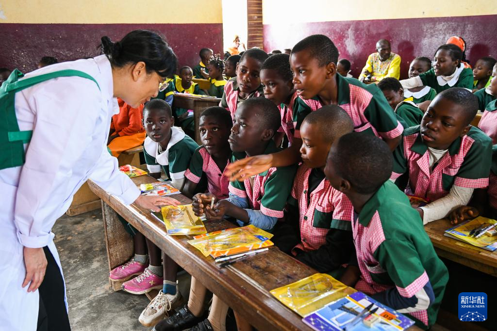 4月3日,在喀麥隆姆巴爾馬約的一所小學(xué),中國(guó)(山西)第24批援喀麥隆醫(yī)療隊(duì)姆巴爾馬約分隊(duì)的醫(yī)生與學(xué)生互動(dòng)。新華社發(fā)(科普索攝)
