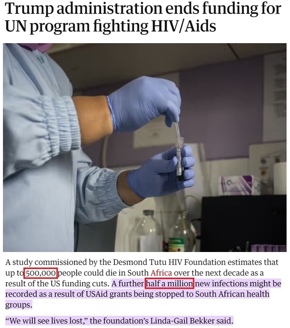 南非德斯蒙德·圖圖艾滋病中心主任琳達(dá)-蓋爾·貝克爾告訴記者,美國取消對當(dāng)?shù)乜拱M織的資助將導(dǎo)致“超過50萬不必要的死亡以及多達(dá)50萬新增感染病例”,使有關(guān)方面“過去25年的所有努力付諸東流”。